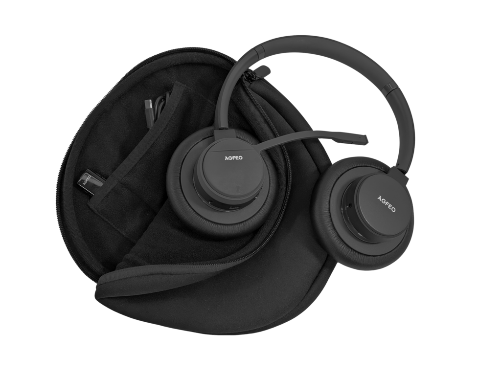 Das Headset Infinty wird in einer handlichen Transporttasche (Softbag) geliefert, in dem das Headset, das Ladekabel und der DECT USB-Dongle sicher verstaut werden können.